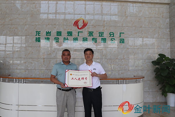 2021年5月14日上午,永定區(qū)總工會黨組書記、副主席劉福華(右二),副主席盧銀玉(左一)在科研樓一樓大廳為我廠煙箱循環(huán)利用整理加工車間榮獲2020年度“省級工人先鋒號”舉行了授牌儀式。