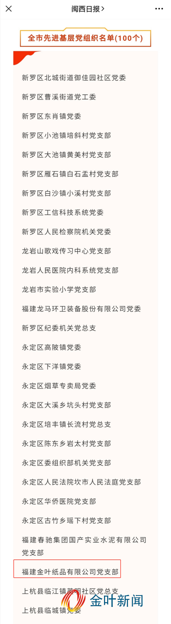 近日,龍巖市委發(fā)布了全市“兩先一優(yōu)”表彰對(duì)象名單,福建金葉紙品有限公司黨支部被授予“全市先進(jìn)基層黨組織”稱號(hào)。