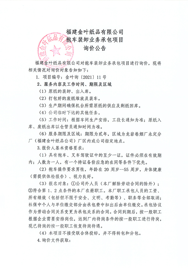 金葉紙品公司抱車(chē)裝卸業(yè)務(wù)承包項(xiàng)目詢(xún)價(jià)公告