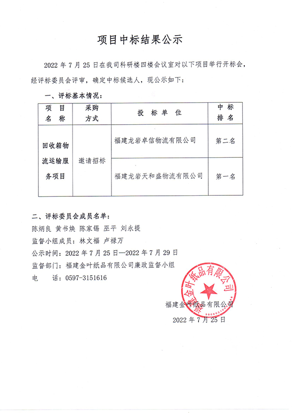 回收箱物流運輸服務項目中標結果公示
